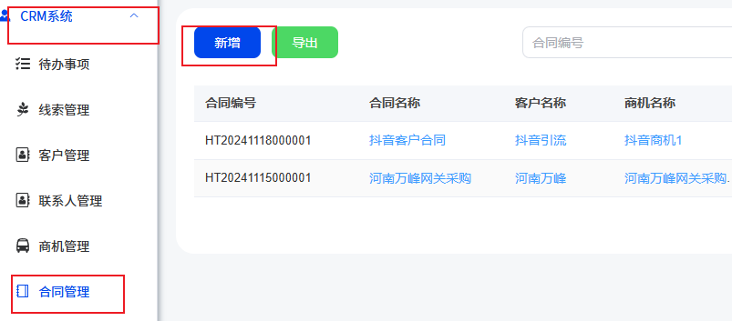 (1)【CRM系统】->【合同管理】->【新增】